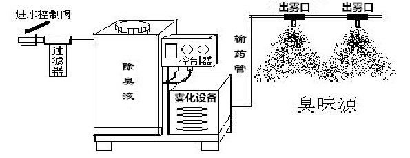 噴淋除臭系統是用水造霧的機電一體化設備;系統機組將原水凈化,加入除臭藥液,加壓至4MPa-7MPa左右,通過高壓管道將藥水混合液通過噴頭噴出,使水化成水霧小顆粒,水霧飄散在臭味源上,從而達到除臭的功效。同時水霧還能起到站內降塵的作用。